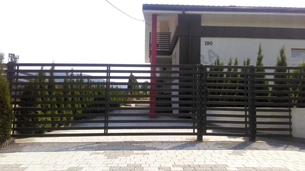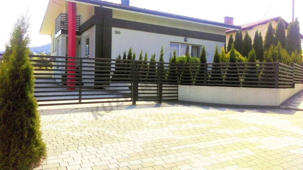Umiejętne wypracowanie harmonii pomiędzy budynkiem a ogrodzeniem zależy od jego formy. Tu poziomie sztachety ogrodzenia współgrają z poziomymi elementami elewacji, podobnie jak spójna kolorystyka. Biel tynków i szarość dachu tworzą jednorodny kolorystyczny klimat z elementami ogrodzenia w grafitowym kolorze.